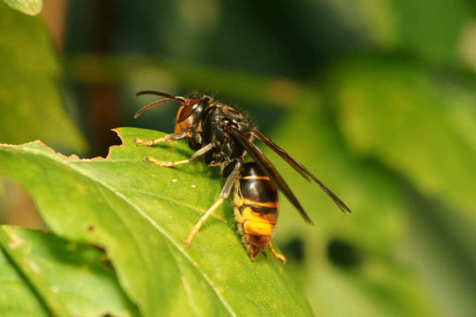 - Couleur : Le frelon asiatique a un corps principalement noir avec des bandes jaunes, tandis que le frelon européen (Vespa crabro) présente un corps plus brunâtre avec des bandes jaunes plus marquées.